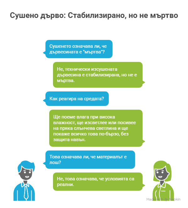 Една от най-честите заблуди е, че след сушене дървото „спира“, „умира“ или „няма какво да му се случи“. Истината от цеха е друга.