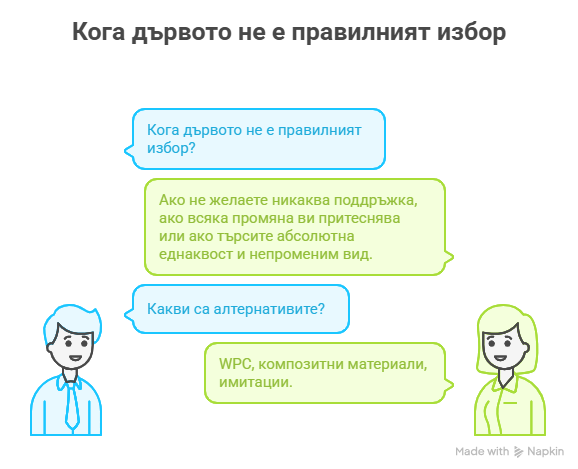 Тогава съществуват алтернативи – WPC, композитни материали, имитации. Те имат своето място и своята логика. Дървото не се състезава с тях. То просто е различно.То просто е различно.