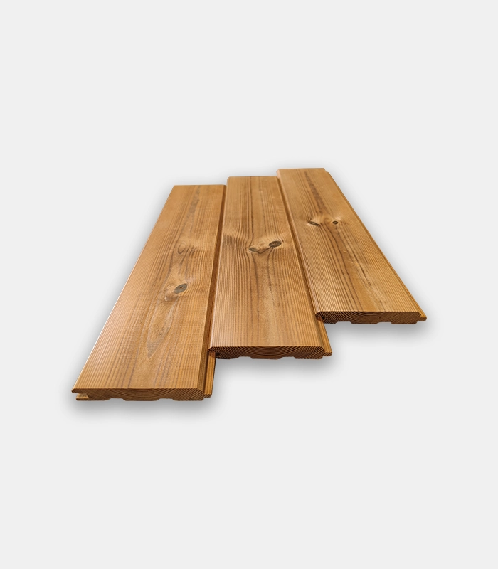 - Характеристики: Получава се чрез термична обработка при висока температура, което променя структурата на дървесината. Това намалява влагопоглъщането и увеличава стабилността. Има характерен тъмнокафяв благороден тон.