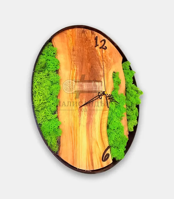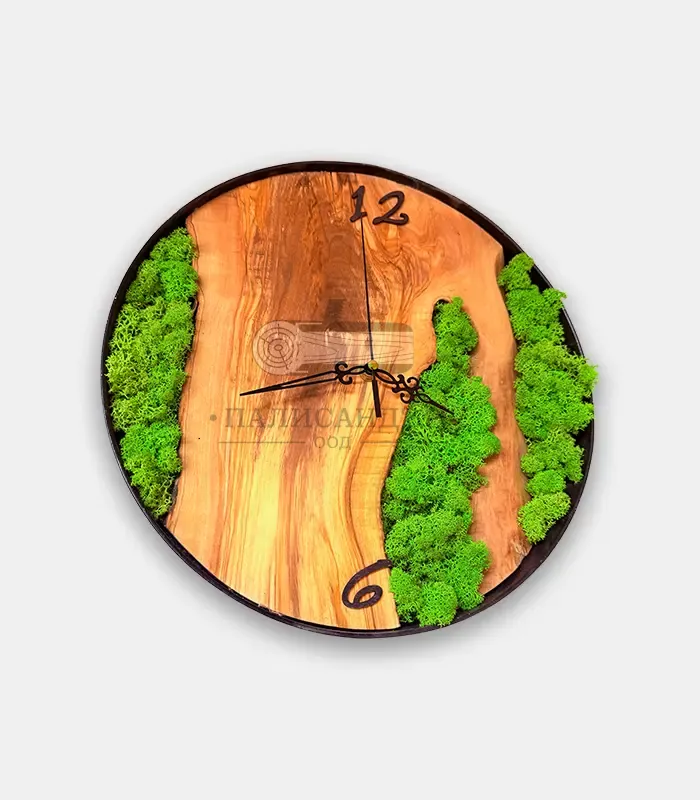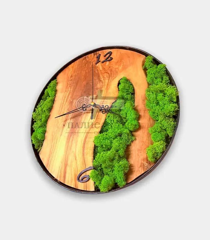 Ръчно изработен стенен часовник от маслиново дърво със скандинавски мъх и метална рамка. Отличава се с елегантни цифри 12 и 6, които подчертават дизайна. Естественият мъх внася свежест и уют, без да задържа прах. Диаметър 38 см.
