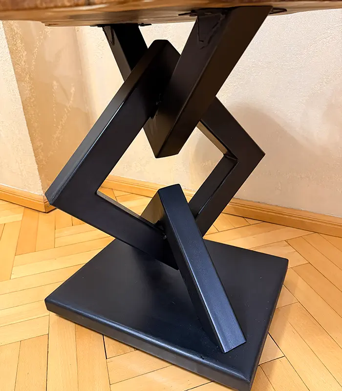 Металната основа е оформена от триъгълни елементи, напомнящи верига. Те създават усещане за движение и стабилност едновременно. Контрастът между топлия орех и индустриалния метал създава силно визуално присъствие.