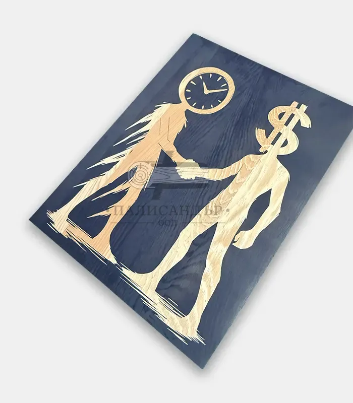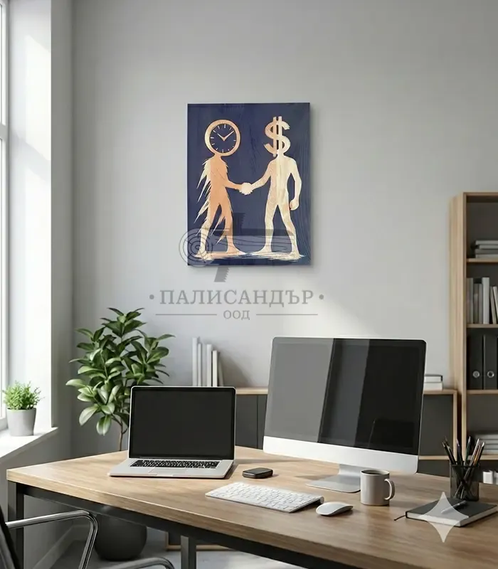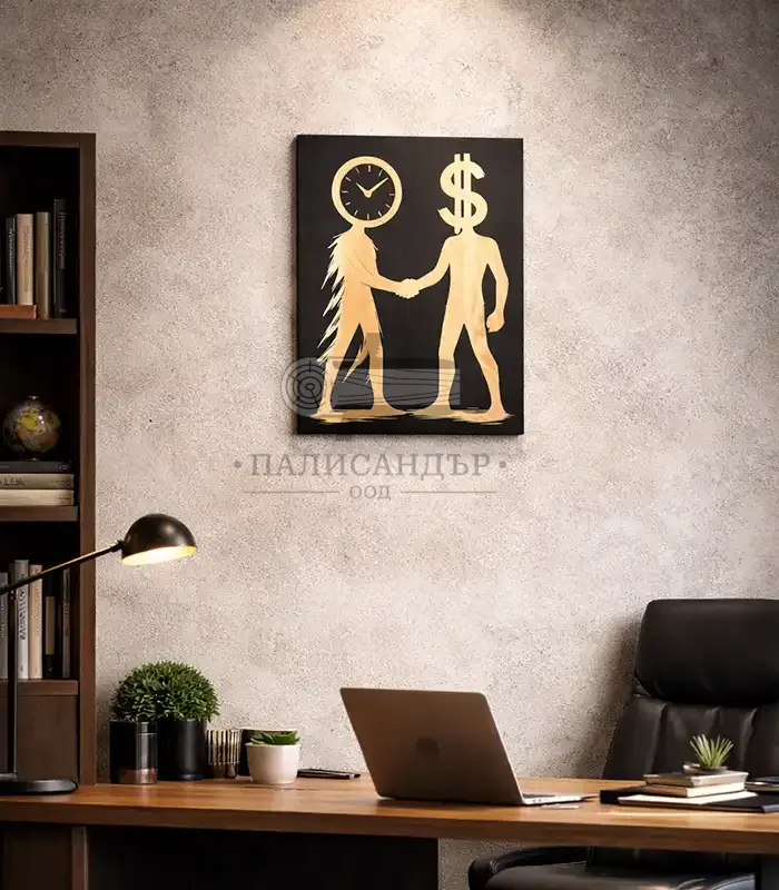 Дървена картина “Time & Money” 30×40см – стилен бизнес декор с дълбоко послание. Символичното ръкостискане между Времето и Парите напомня, че всяко решение е инвестиция. Идеална за офис, кабинет или вдъхновяващ подарък.