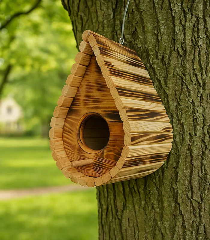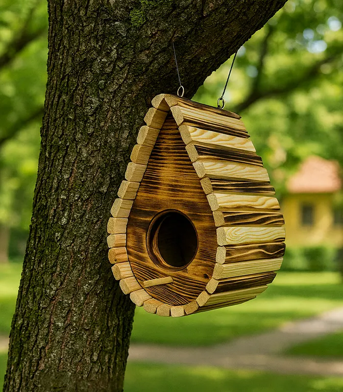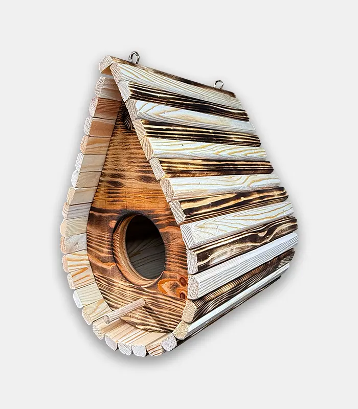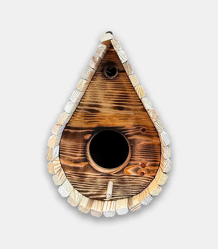 Ръчно изработена дървена къщичка за птици с елегантна форма тип „капка“ и обгорена повърхност за автентичен външен вид. Подходяща за малки пойни птици и за окачване в градина, двор или балкон.
