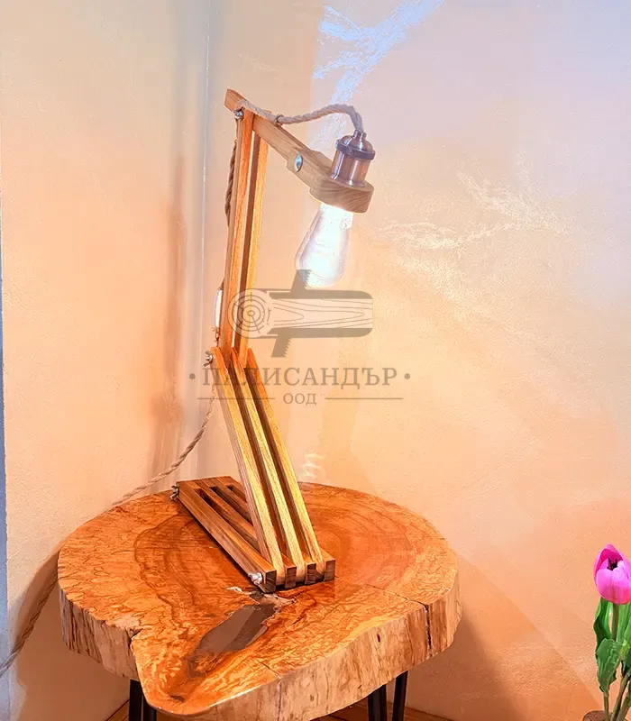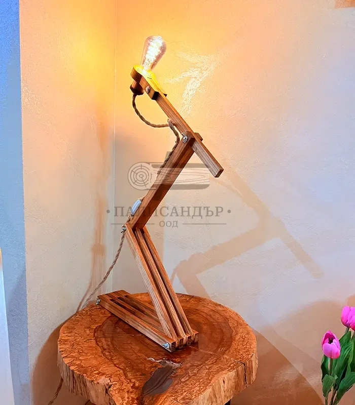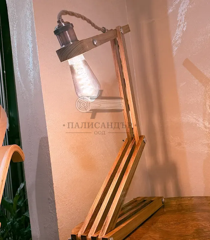 Лампа Zetto е дизайнерски осветителен обект, създаден да бъде едновременно функционален и визуално въздействащ. Изработена от масивна акация, лампата впечатлява със своята сгъваема Z-образна конструкция, която позволява да заема различни форми и да се адаптира към пространството и настроението.
