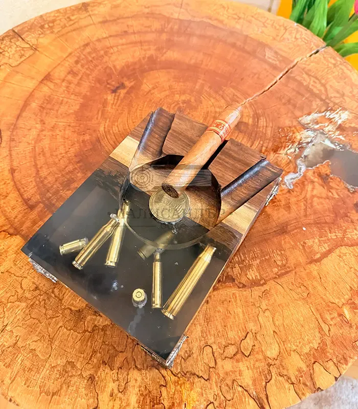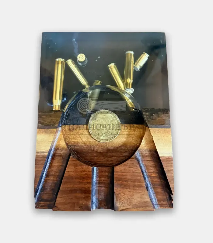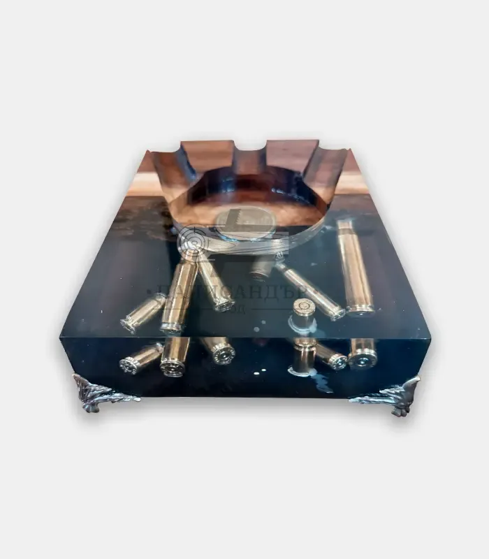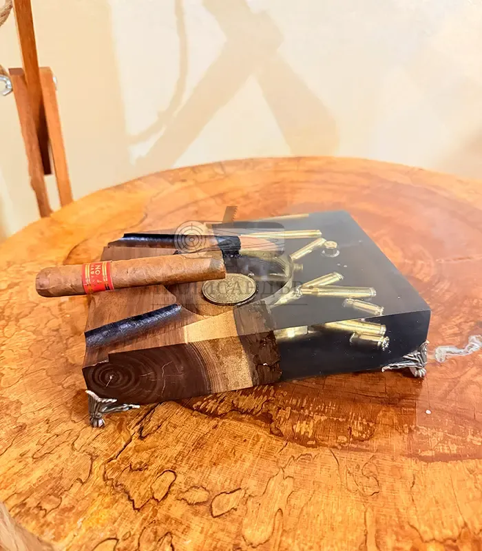 Комбинацията от естествено масивно дърво и прозрачна епоксидна смола разкрива вградени ловни елементи, които придават дълбочина и силно визуално въздействие. Всеки пепелник е уникален по своята шарка и композиция.