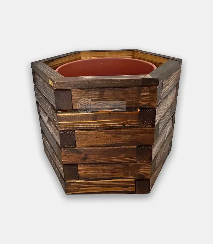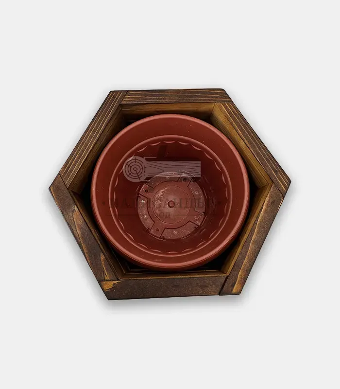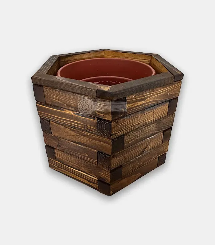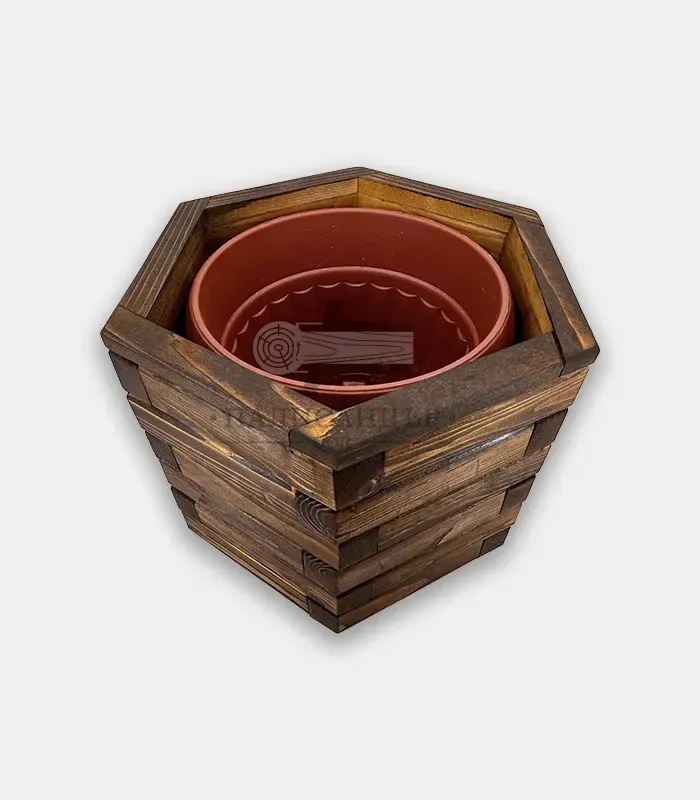 Шестоъгълна кашпа – естетика и стабилност в компактна дървена форма с модерен геометричен облик.